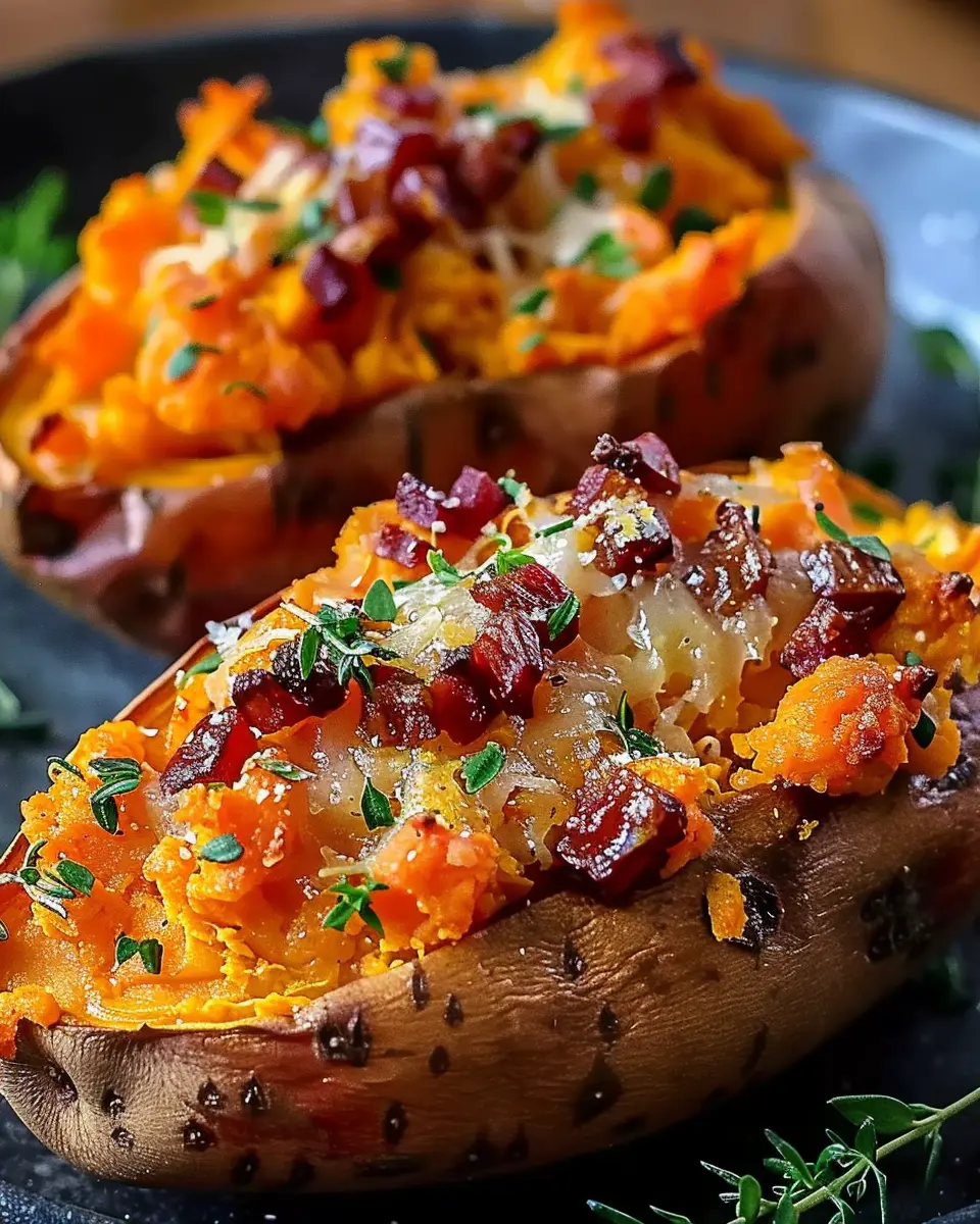 A delicious and easy recipe for baked sweet potatoes topped with crispy turkey bacon, perfect for a comforting meal.