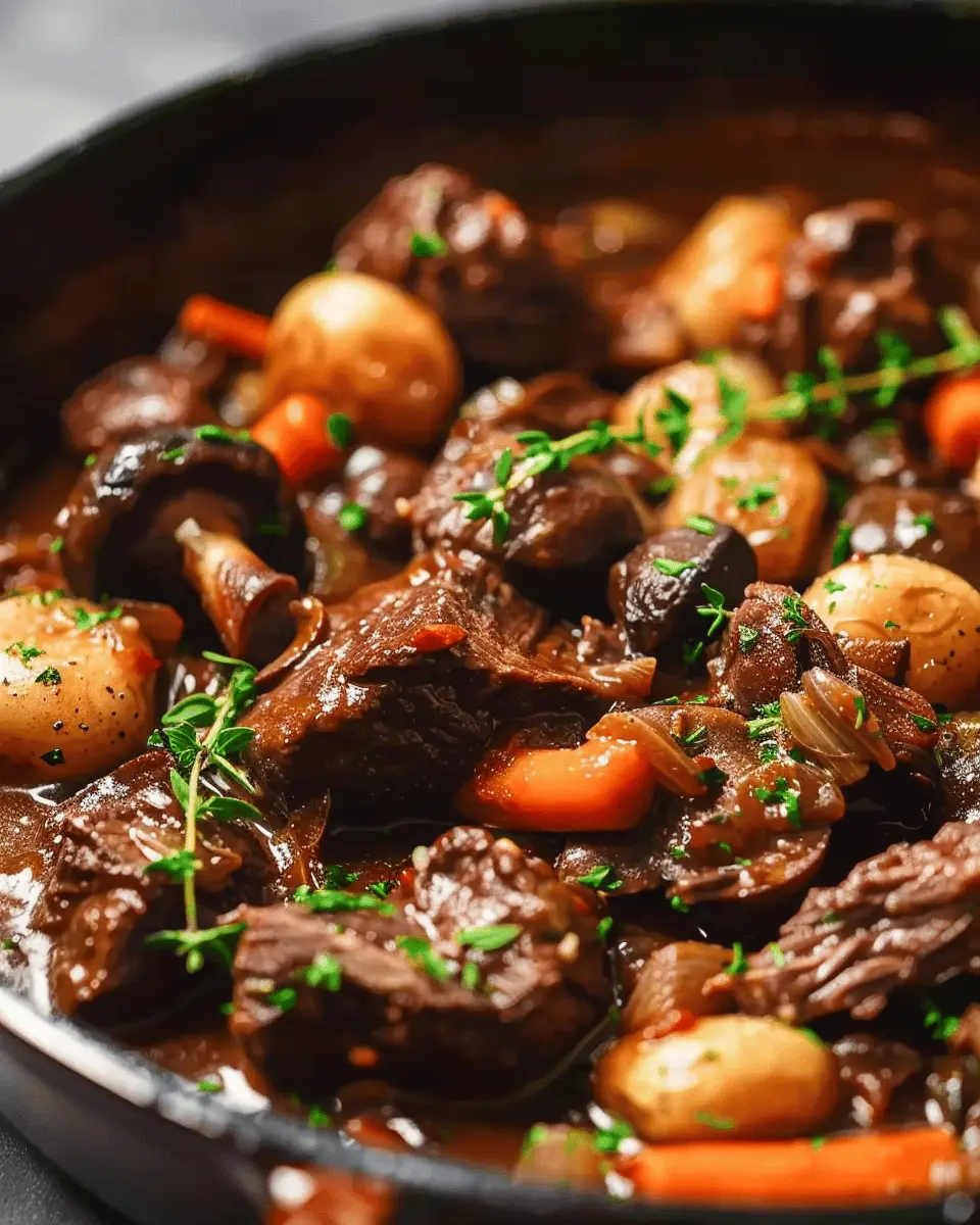 A delicious and hearty Beef Bourguignon recipe featuring the unique addition of turkey bacon for a comforting twist. Perfect for family dinners.