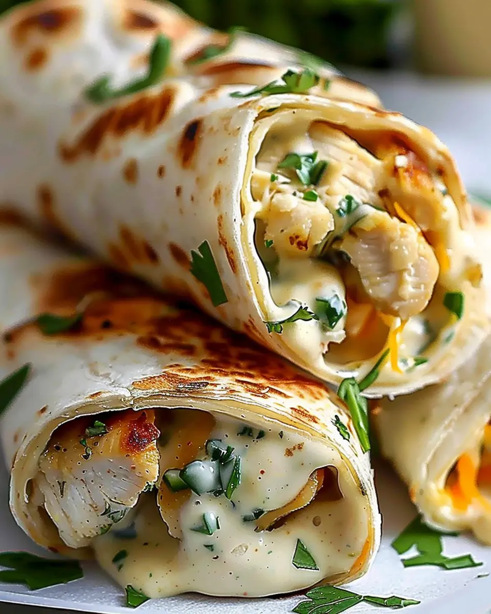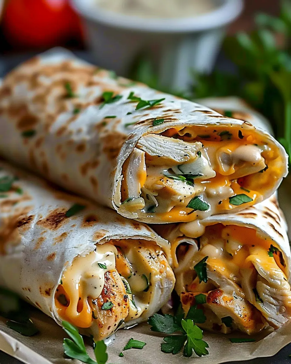 Enjoy cheesy chicken garlic wraps, an easy indulgence for food lovers!