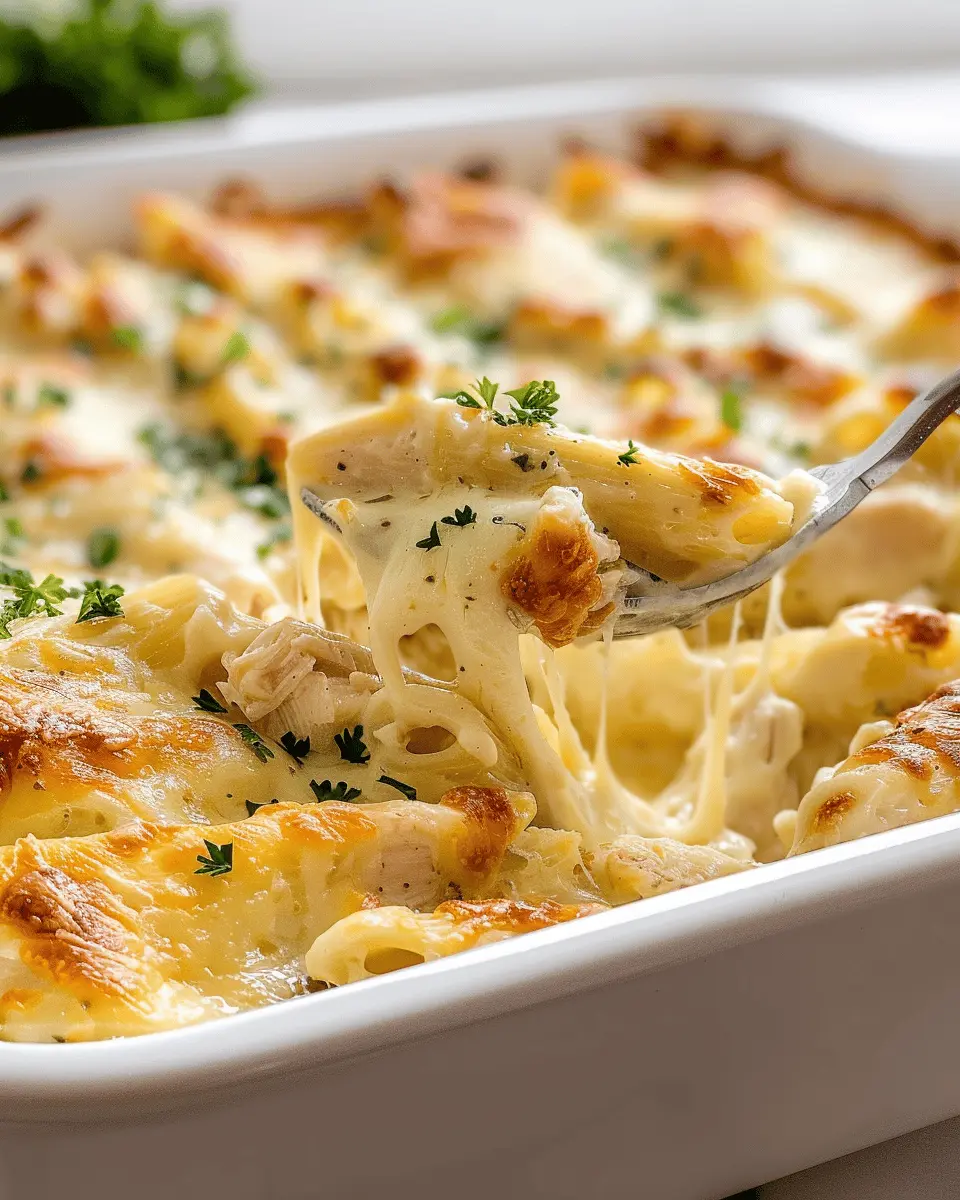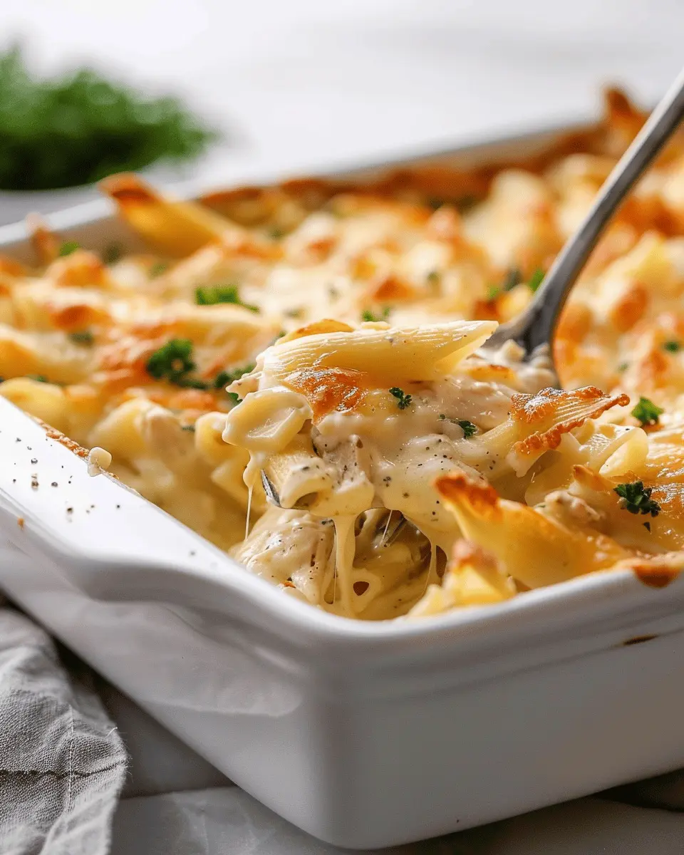 What makes this recipe a game-changer? For starters, it’s a one-dish wonder! You can throw everything into a baking dish, pop it in the oven, and let it work its magic while you tackle that pile of laundry or catch up on your favorite series. The creamy Alfredo sauce, paired with tender chicken, pasta, and a crispy topping, is the kind of meal that replenishes your energy without draining your time.