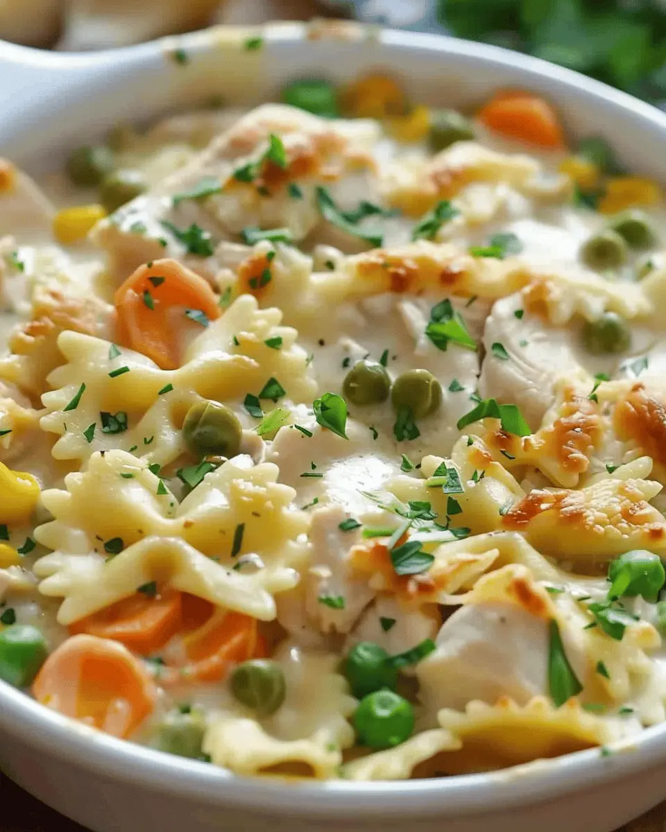 Each bite invites you to savor the creamy, comforting taste reminiscent of those cozy winter nights spent enjoying a traditional pot pie. It’s also versatile, allowing you to mix in seasonal veggies or your favorite pasta shape, making it endlessly adaptable.