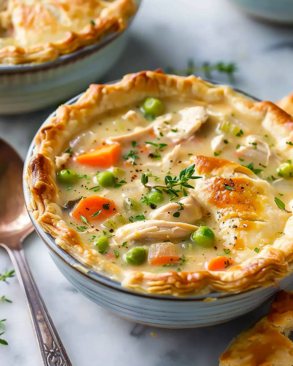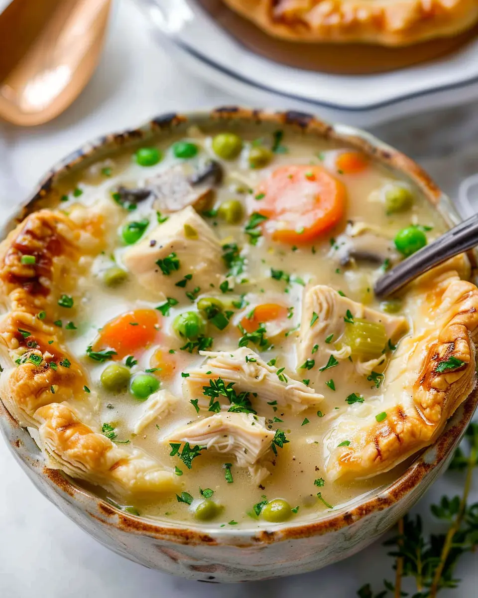 For those days when you crave something lighter or plant-based, try a vegetarian chicken pot pie soup using plant-based chicken. There are great meat alternatives available today that can mimic the texture and flavor of chicken, such as products from Beyond Meat or Gardein.