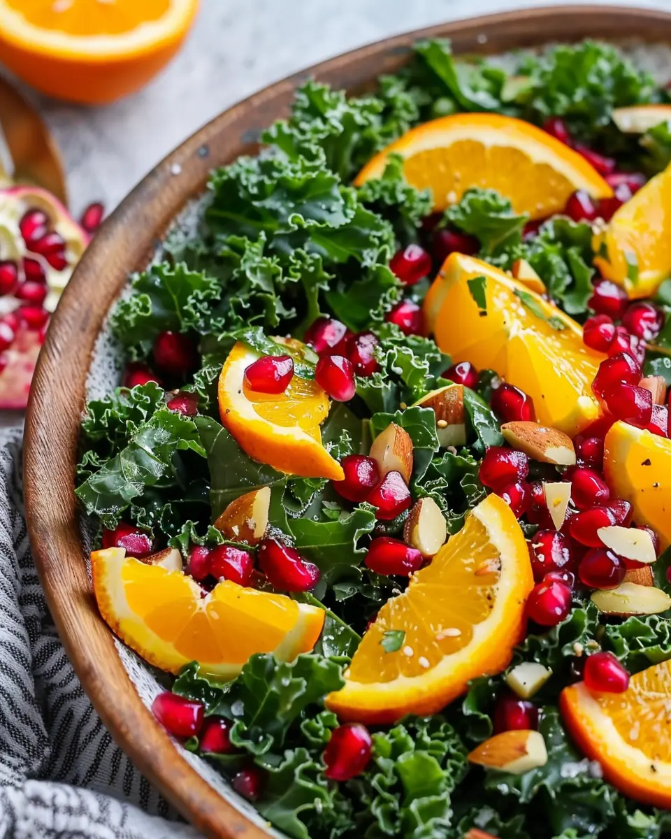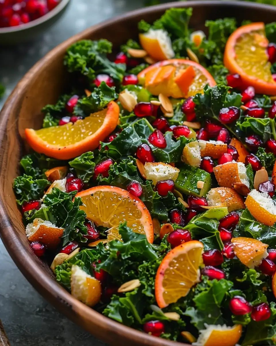 A bright and healthy salad featuring kale, citrus fruits, and pomegranate seeds, ideal for a refreshing meal or side dish.