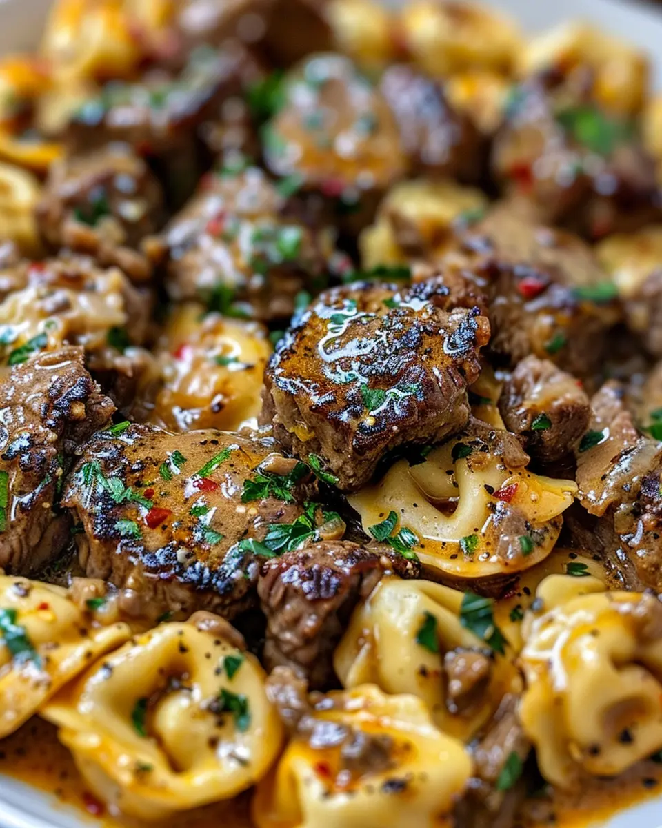 Mix It Up: Carefully add the cooked tortellini to the skillet with the steak and sauce. Gently toss everything together, ensuring that the tortellini is coated with the luxurious sauce and all the delicious bits from the skillet.