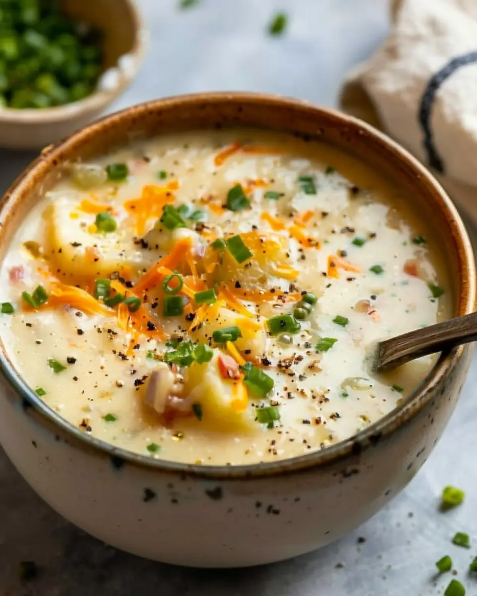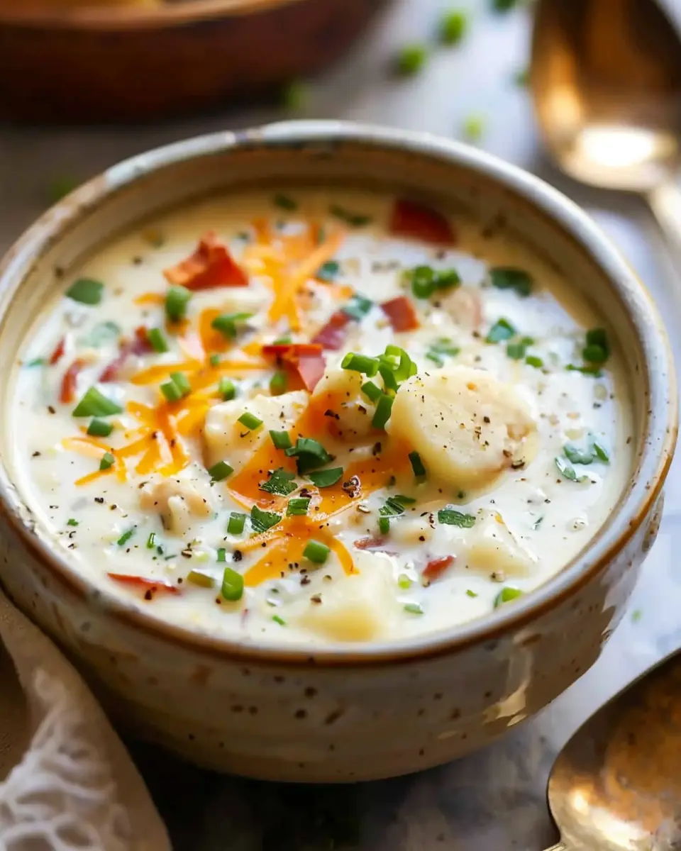This creamy potato soup, enhanced with turkey bacon and chicken ham, is perfect for a comforting meal.