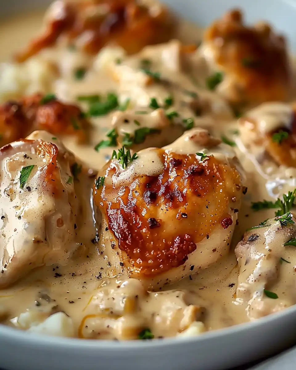 PrintCreamy Smothered Chicken: Indulgent Recipe with Turkey Bacon Delight