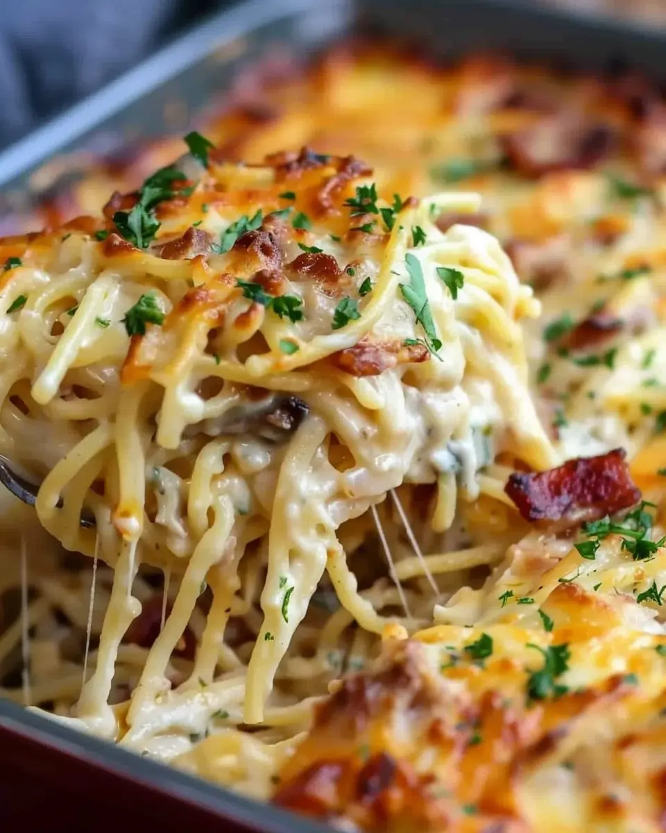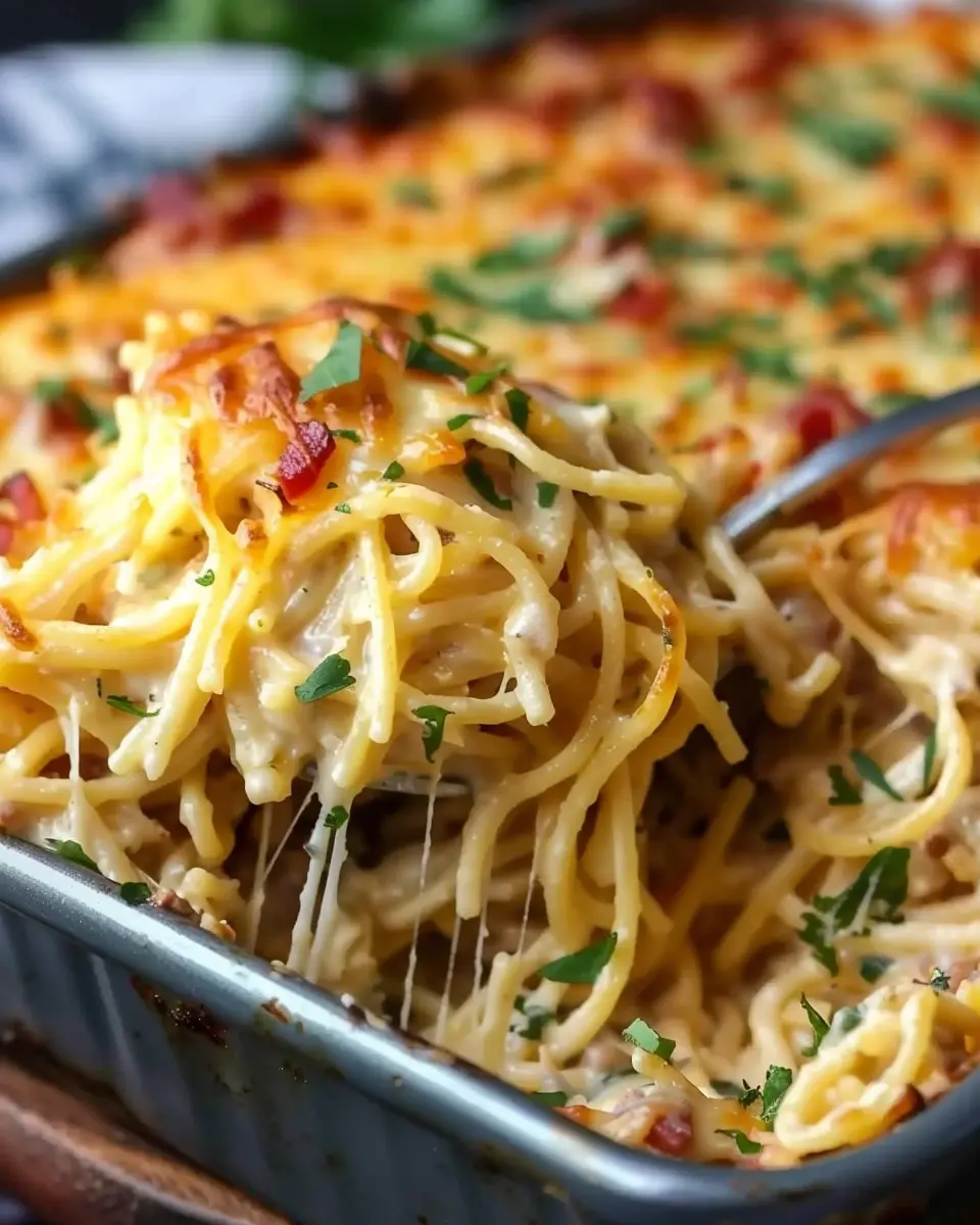 Creamy Southern Spaghetti Bake with Turkey Bacon