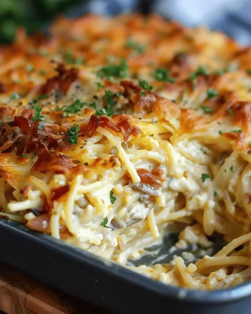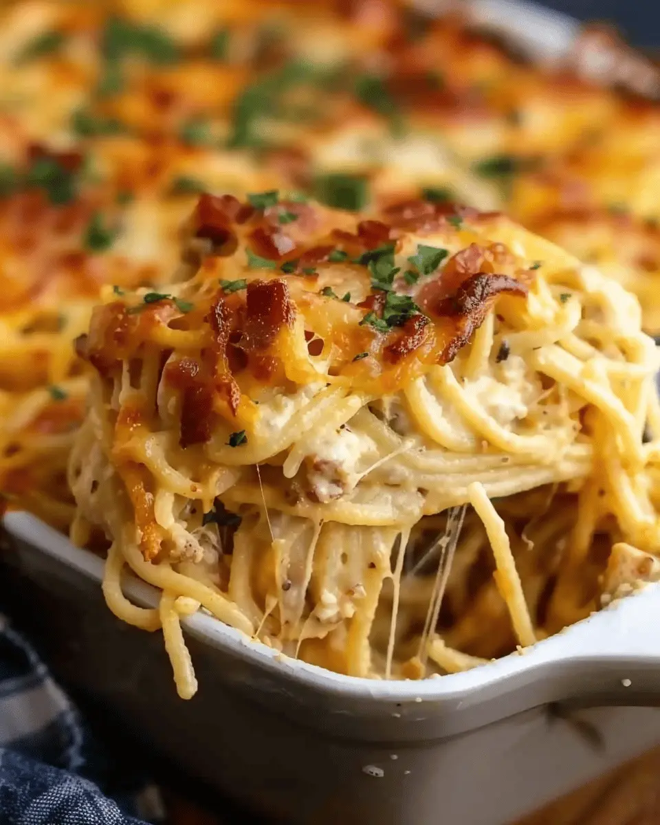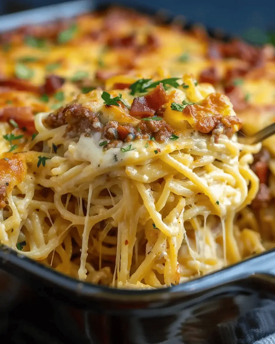 Creamy Southern Spaghetti Bake with Turkey Bacon