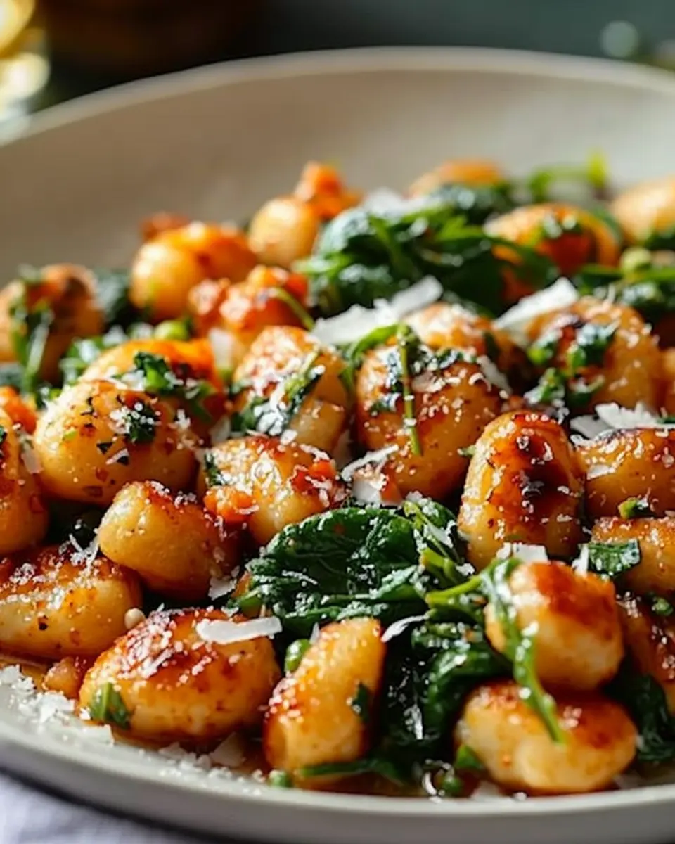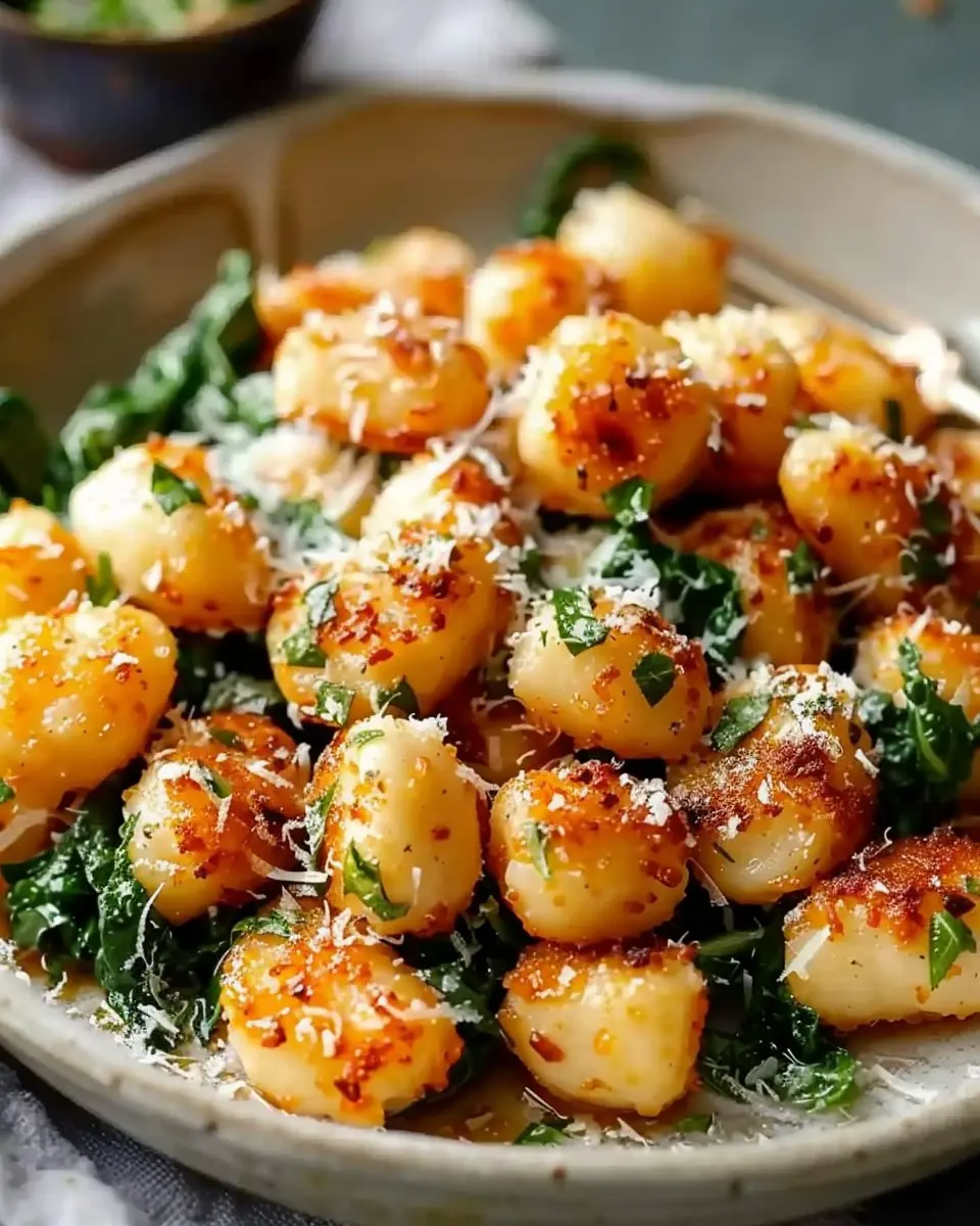 The combination of crispy gnocchi with sautéed garlic and spinach creates a colorful, vibrant dish that’s as appetizing as it is nourishing. Plus, spinach packs a nutritional punch, which is always a bonus.