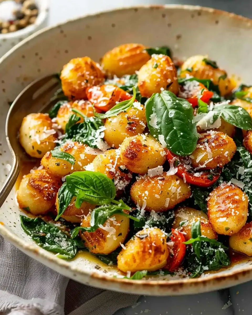 - Incorporate fresh spinach: Then, add a handful of spinach leaves. It wilts quickly and adds a lovely color and nutrient boost. Stir gently to combine all the flavors without breaking the crispy edges of the gnocchi.