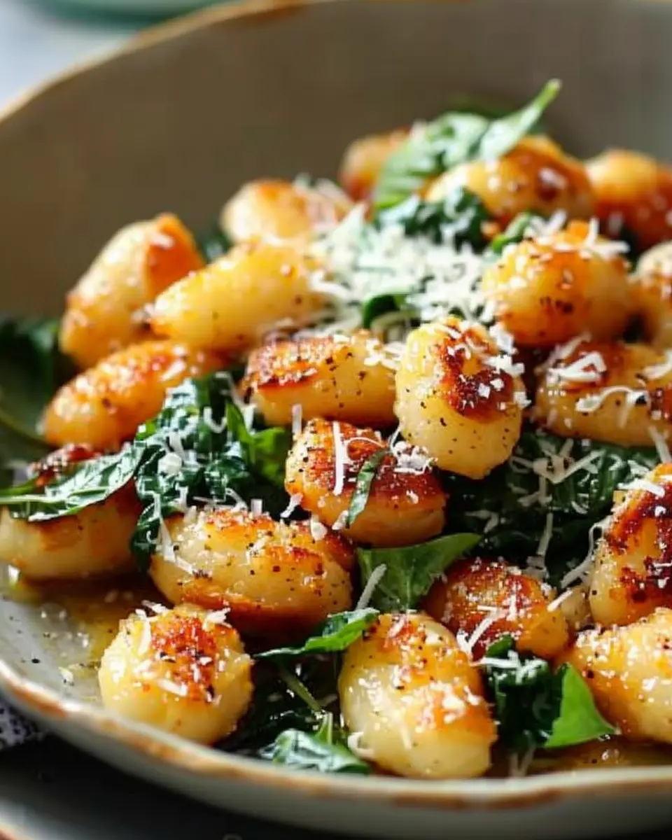 To finish, give everything a gentle toss to mix the flavors. If desired, a squeeze of fresh lemon juice will brighten the dish, making your crispy gnocchi not only a feast for the eyes but also for the palate.