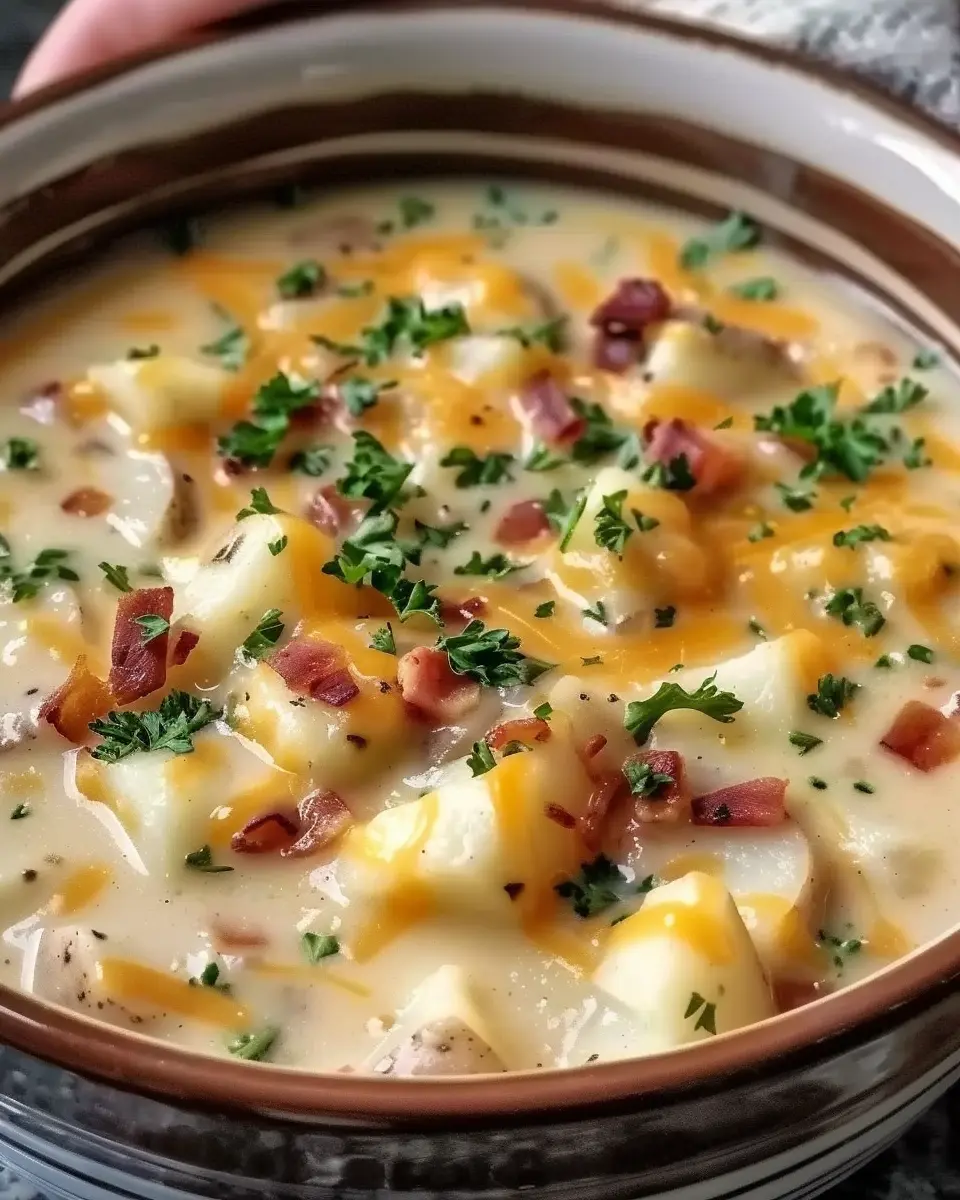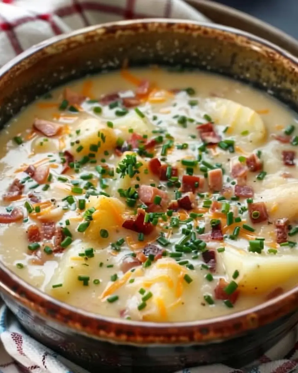 Discover the creamy and delicious Crock Pot Crack Potato Soup made with turkey bacon and chicken ham, perfect for a comforting meal.