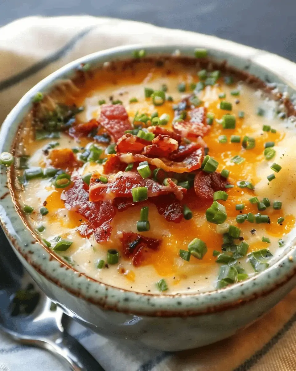When it’s time to serve, garnish each bowl with freshly chopped chives or green onions and a sprinkle of additional cheddar cheese. This not only looks appealing but adds freshness to the hearty soup. A warm, comforting bowl is perfect for cozy nights in or serving at gatherings.