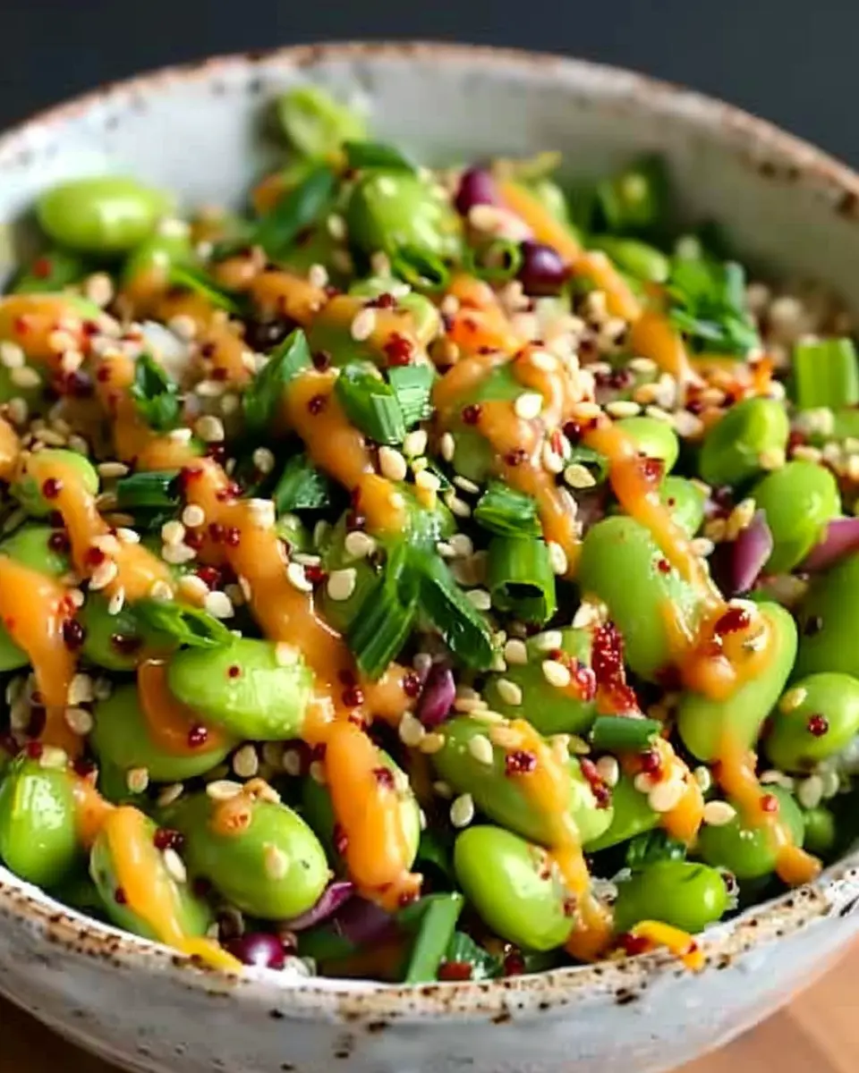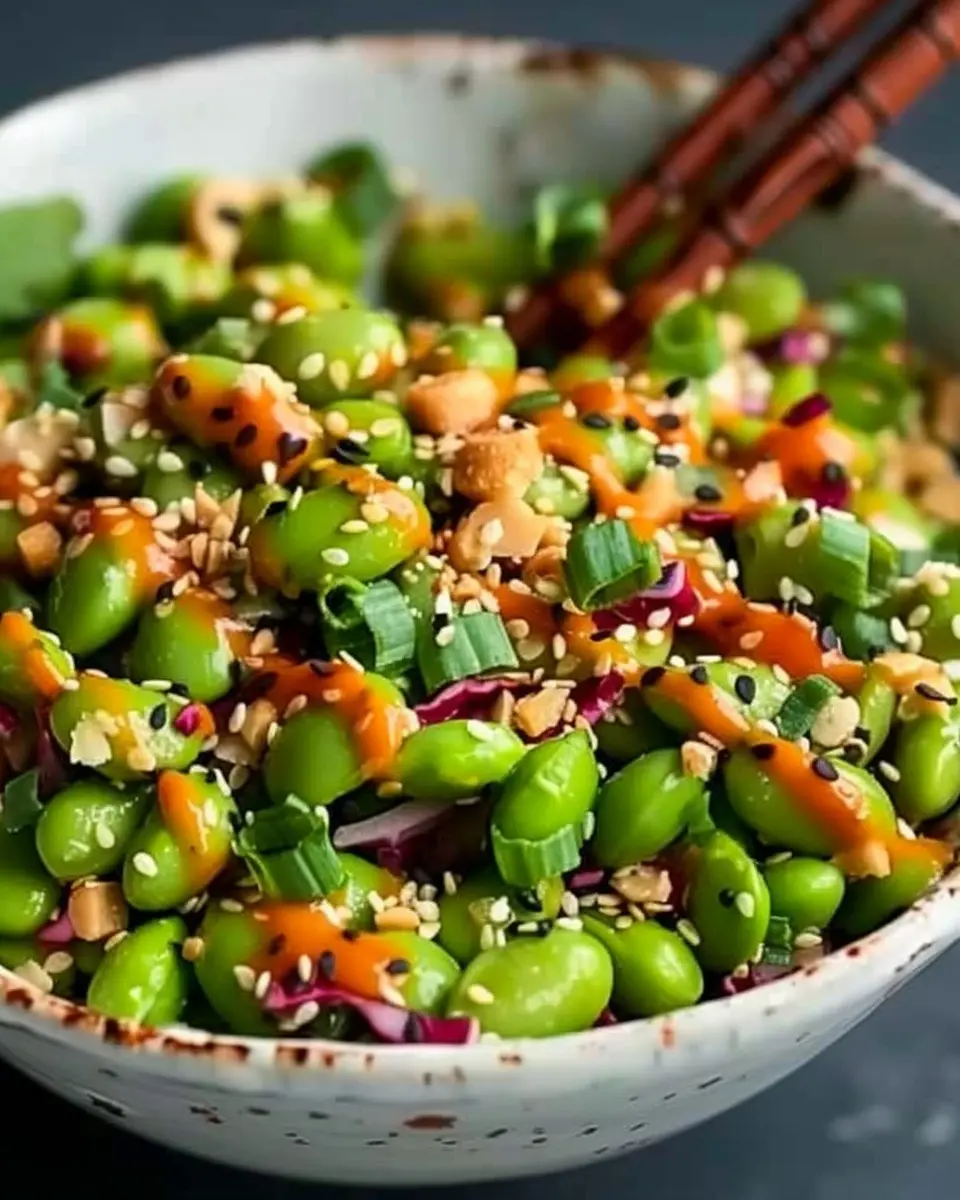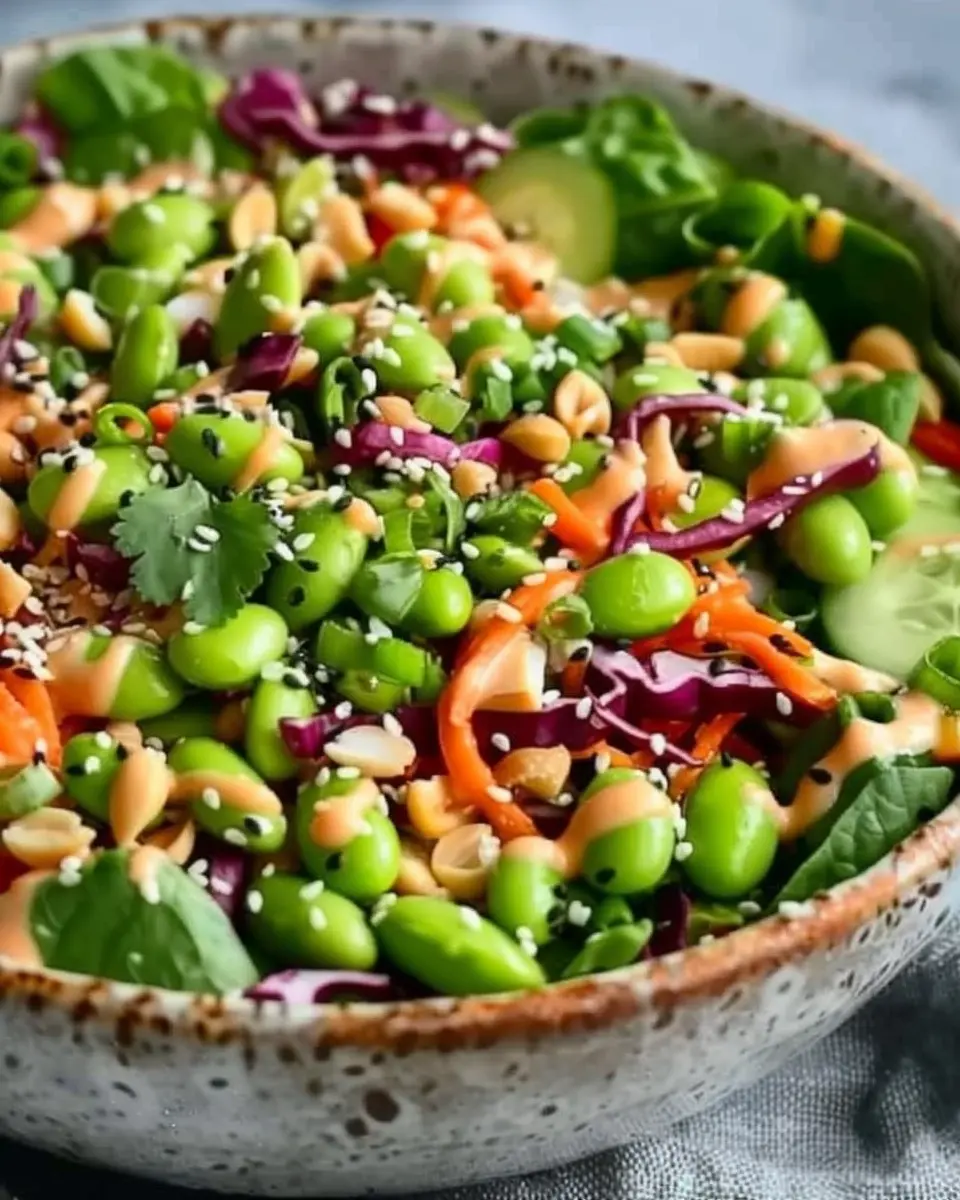 A vibrant and healthy salad featuring crunchy edamame, fresh vegetables, and a delicious Asian-inspired dressing.