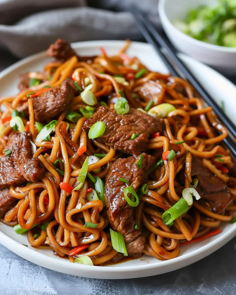 A flavorful and quick beef lo mein recipe that can be made at home.