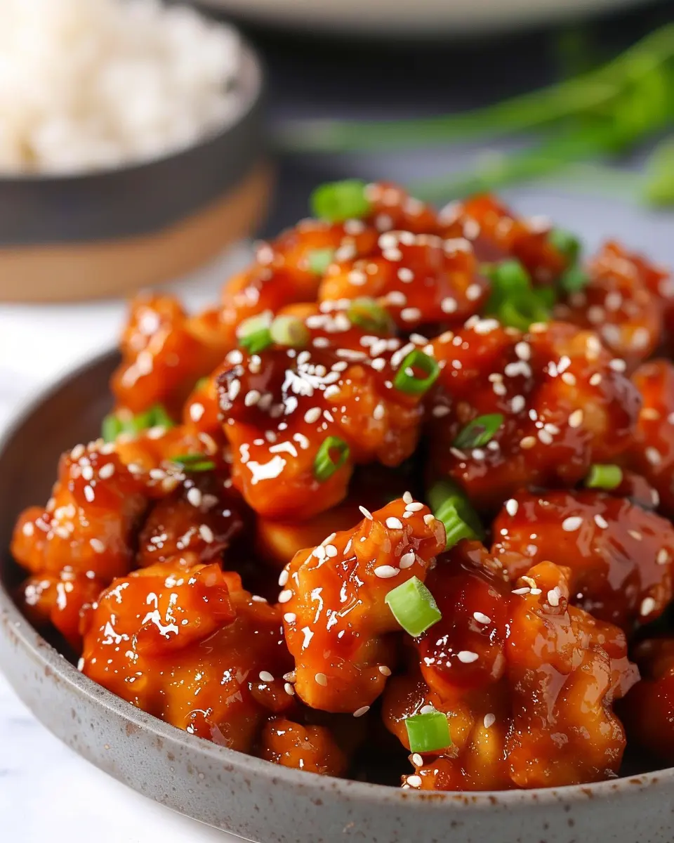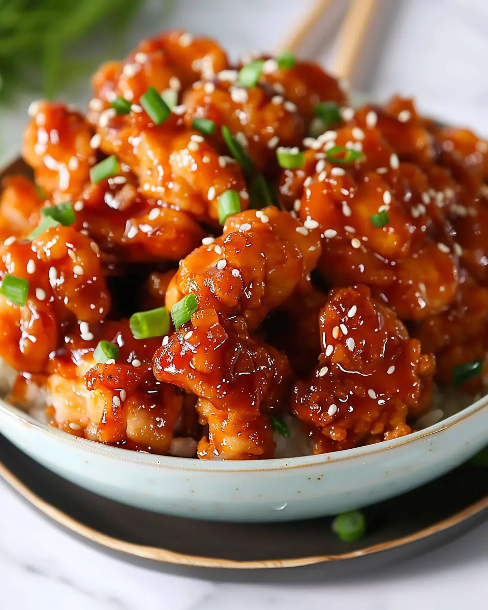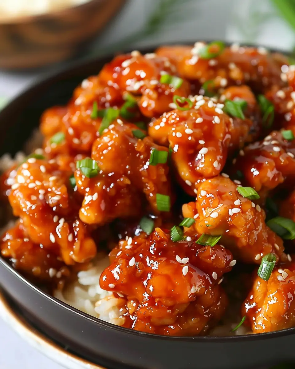 Return the fried chicken to the skillet and toss it thoroughly in the sauce, ensuring every piece is well-coated. This is your moment to shine—don’t forget to sprinkle additional sesame seeds and sliced green onions for that extra flair.