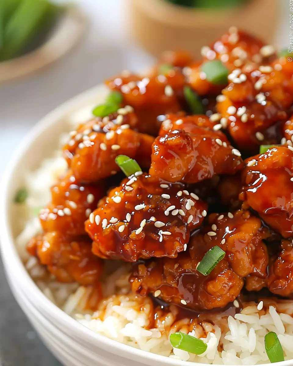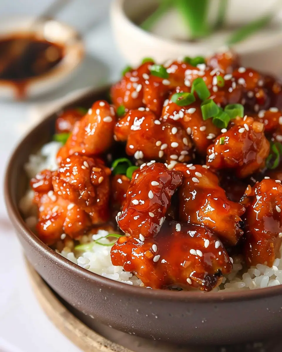 - Serve the chicken on a bed of rice topped with a sprinkle of sesame seeds and sliced green onions.