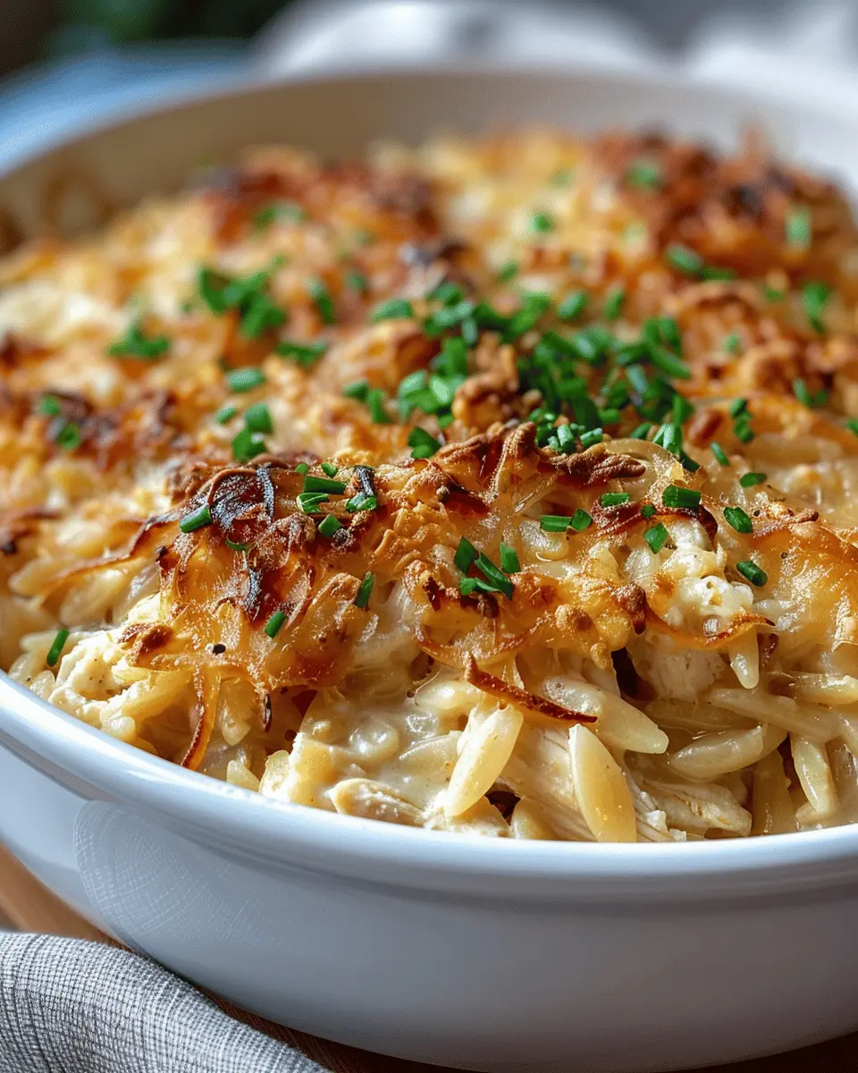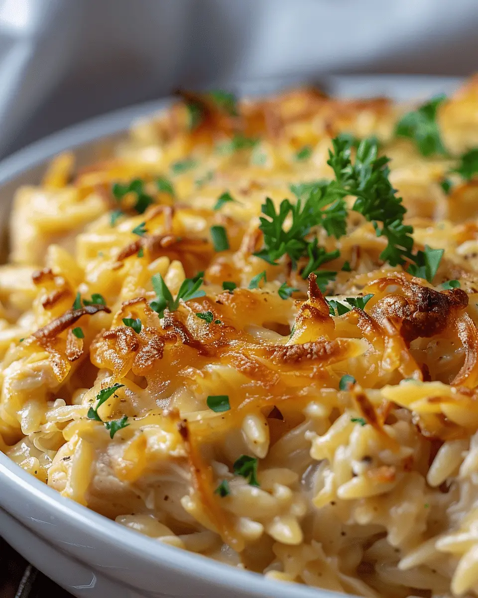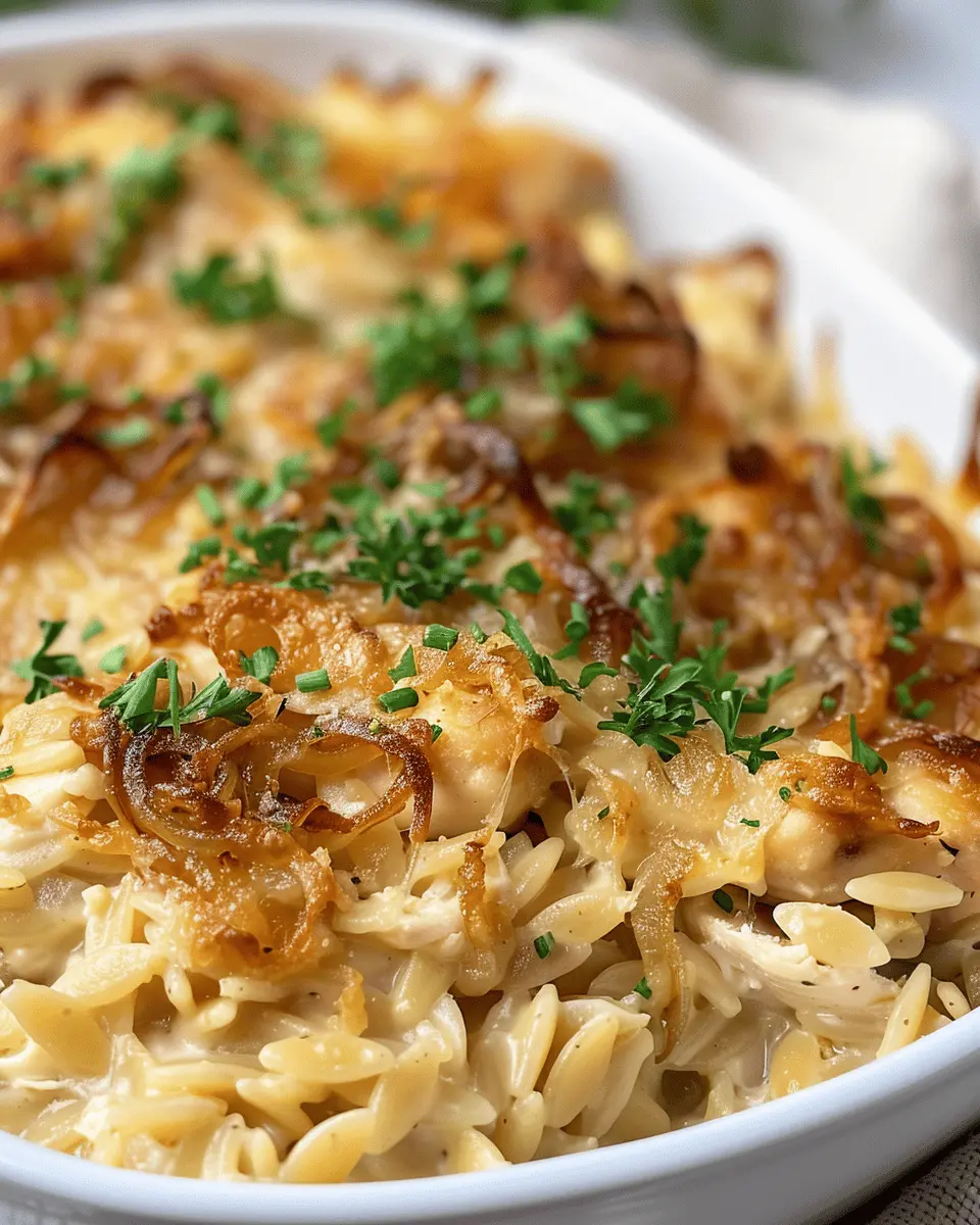 Whether you’re sharing it with friends or enjoying it during a quiet night in, the French Onion Chicken Orzo Casserole is sure to become a family favorite. Stay tuned to learn just how easy it is to create this dish that promises both comfort and flair.