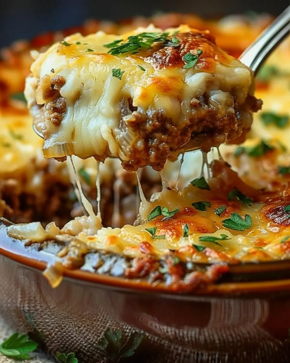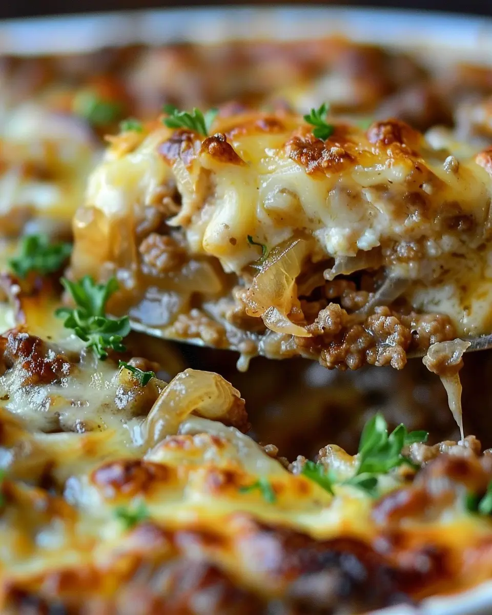A deliciously satisfying dish that combines the flavors of French onion soup with ground beef, perfect for comfort food lovers.