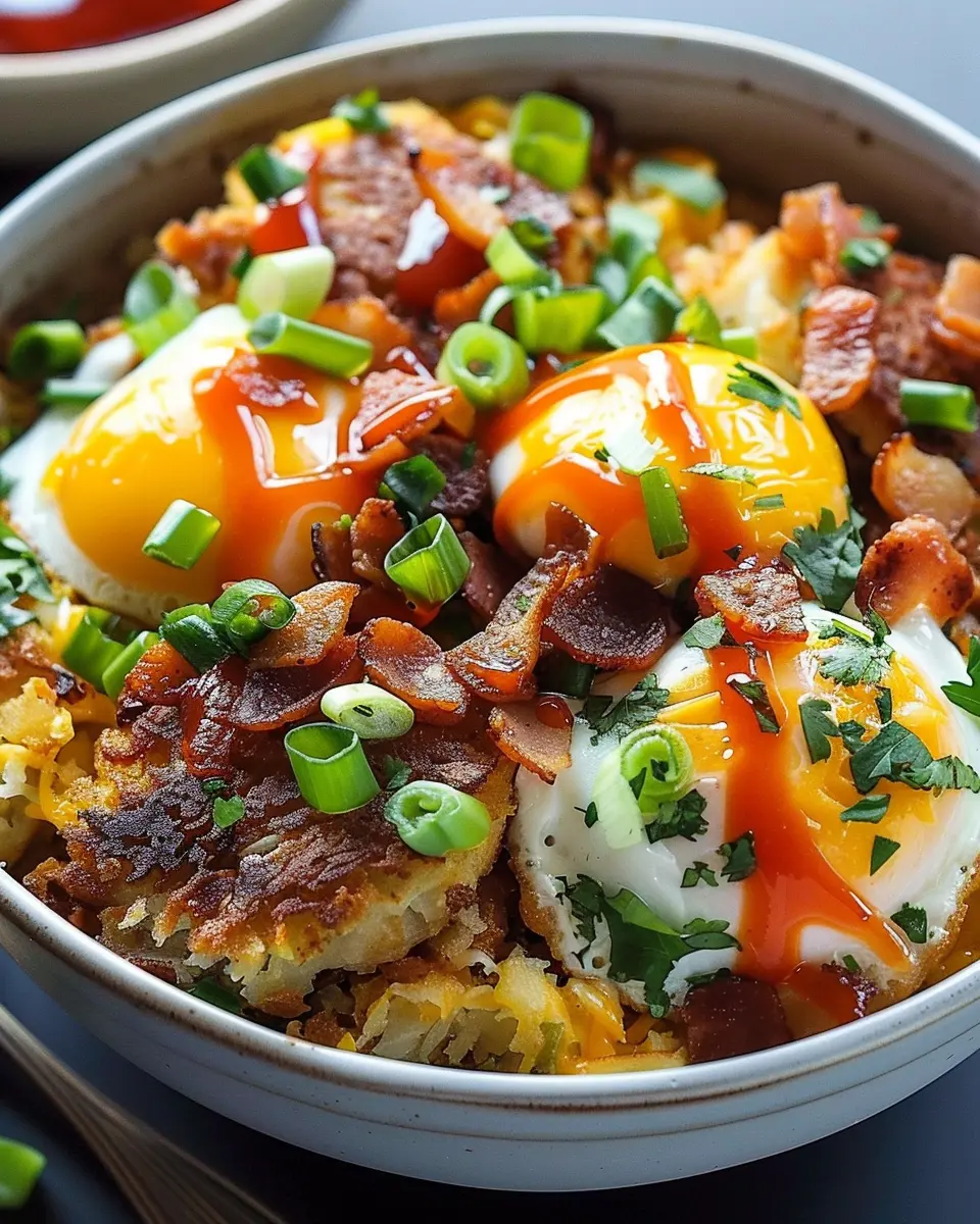 Base Layer: Start with a generous scoop of crispy hash browns at the bottom of your bowl.