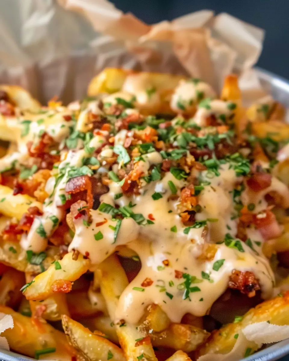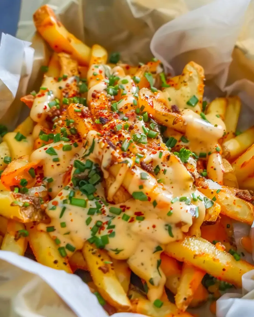 Once your fries are baked to golden perfection, it’s time for the fun part—assembly! On a large serving platter, layer the crispy fries and generously drizzle the Cajun ranch cheese sauce over the top.