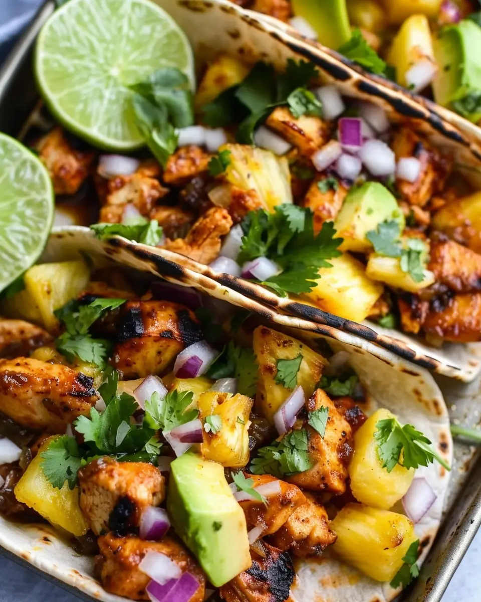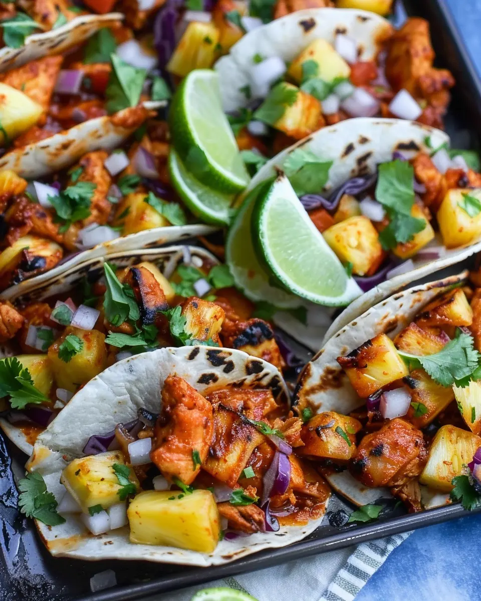 Choosing the right tortillas can elevate your One Pan Chicken & Pineapple Tacos experience. Flour tortillas are soft and chewy, perfect for holding all that delicious filling without falling apart. If you prefer a healthier option, whole wheat or corn tortillas can be great too. They offer a more classic taco flavor and texture. Consider warming them up in a pan or directly on the stovetop for a few seconds to enhance their taste before serving.