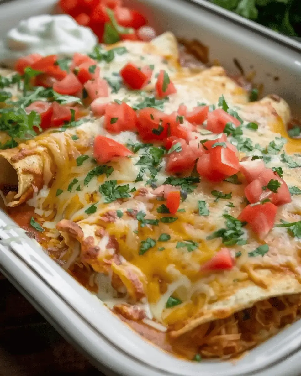 - Fill each tortilla with the chicken mixture, roll tightly, and place seam-side down in a baking dish.