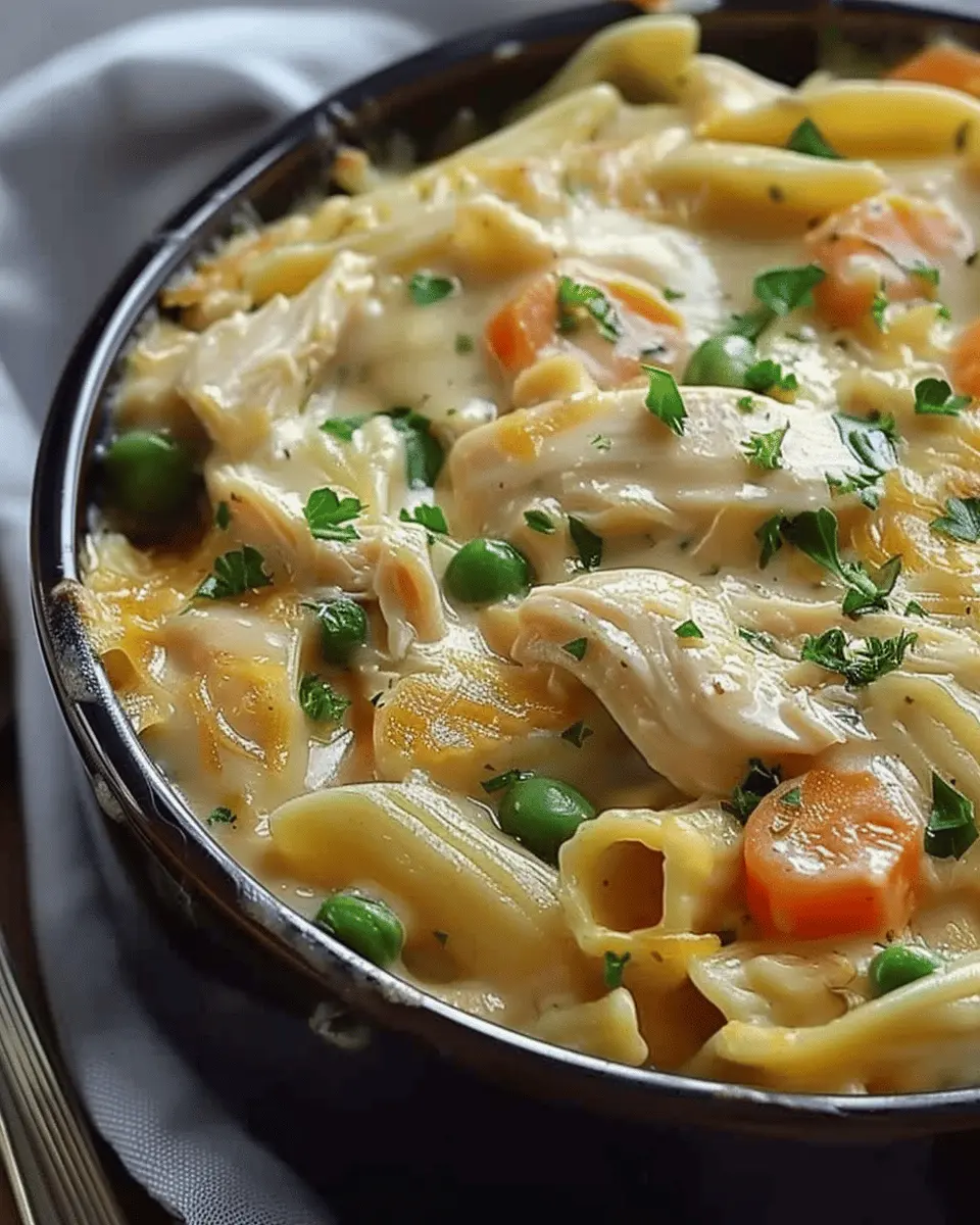 You’ve made it to the final step! Add the cooked egg noodles back into your creamy sauce with chicken and veggies. Gently toss until every noodle is coated in that rich, comforting sauce—this is what dreams are made of!