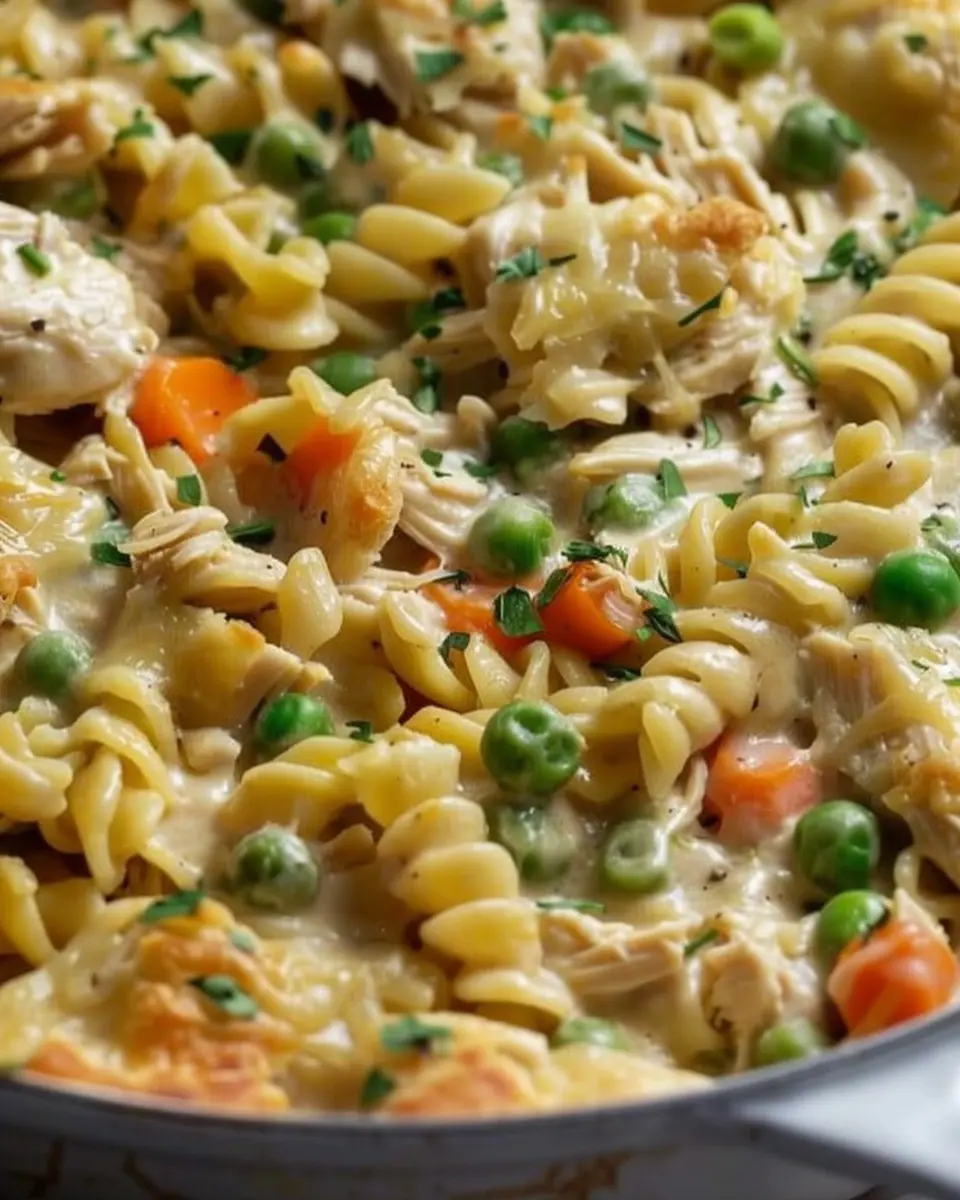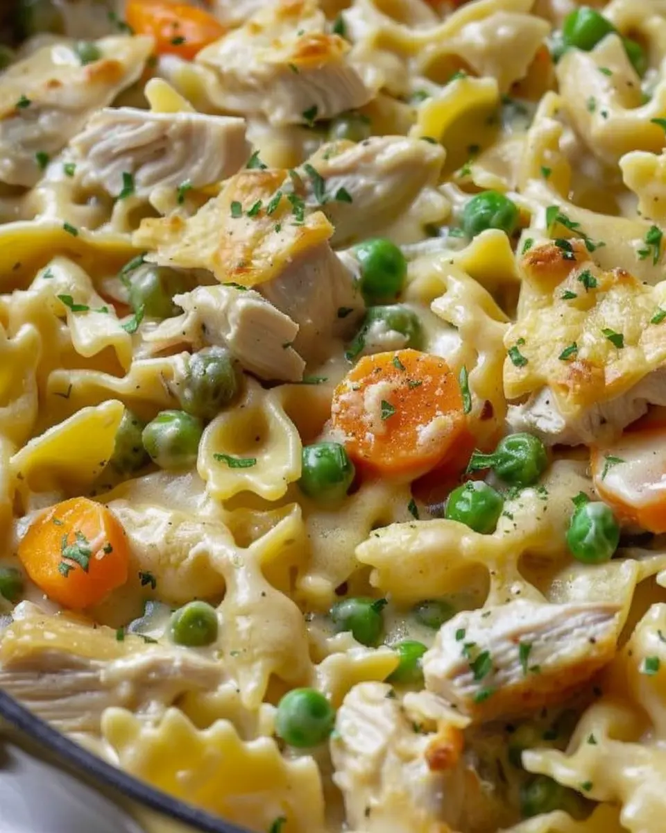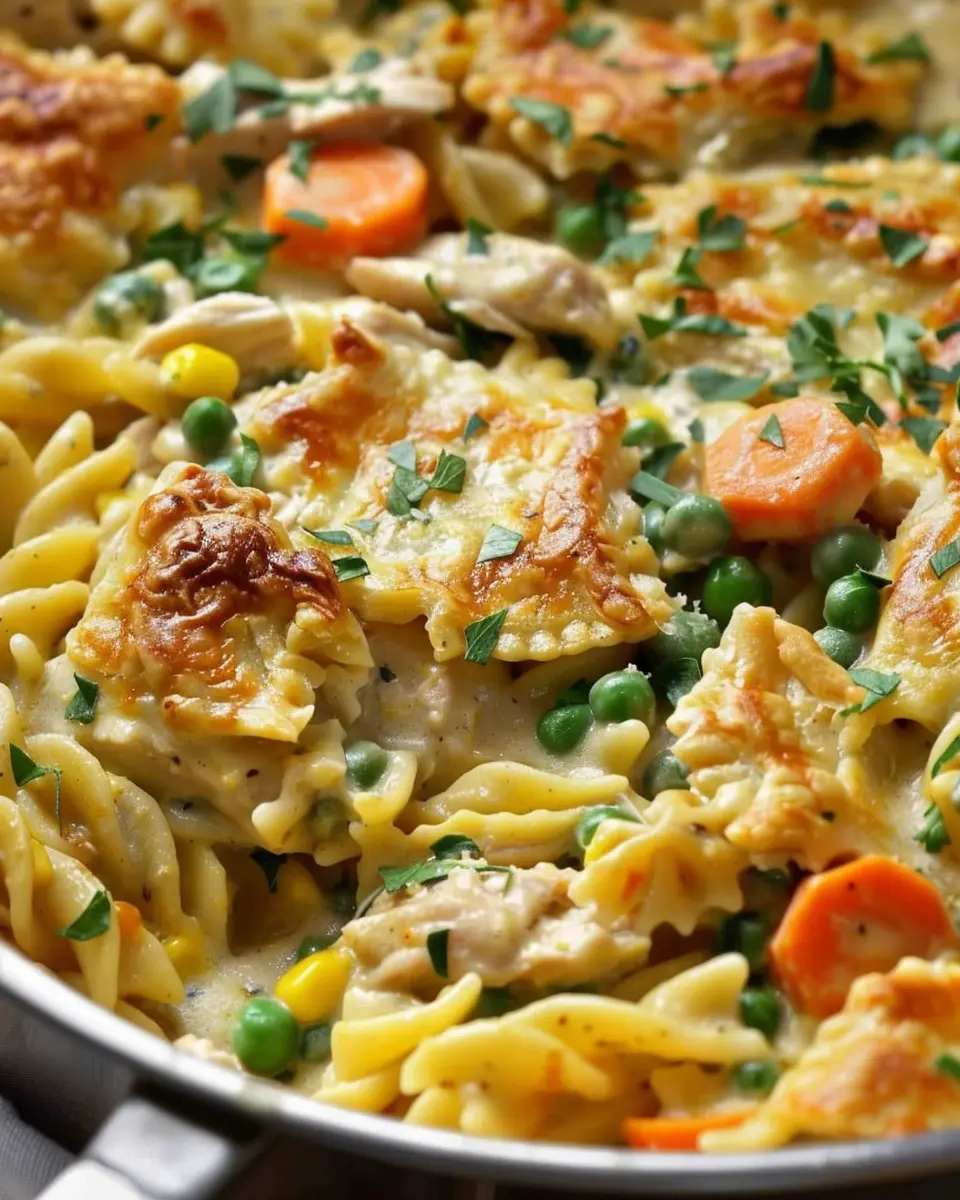 Plate up your quick chicken pot pie pasta, a comforting blend that offers a delightful twist on a classic. You can garnish with fresh herbs like parsley or chives for a pop of color and freshness.