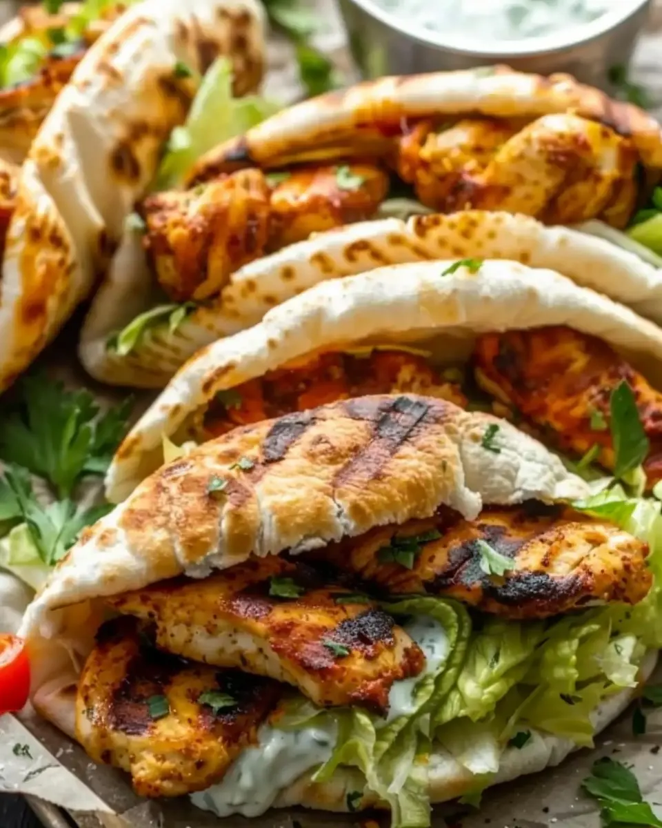 7. Assemble the pitas by placing chicken, lettuce, tomatoes, and tzatziki sauce inside.