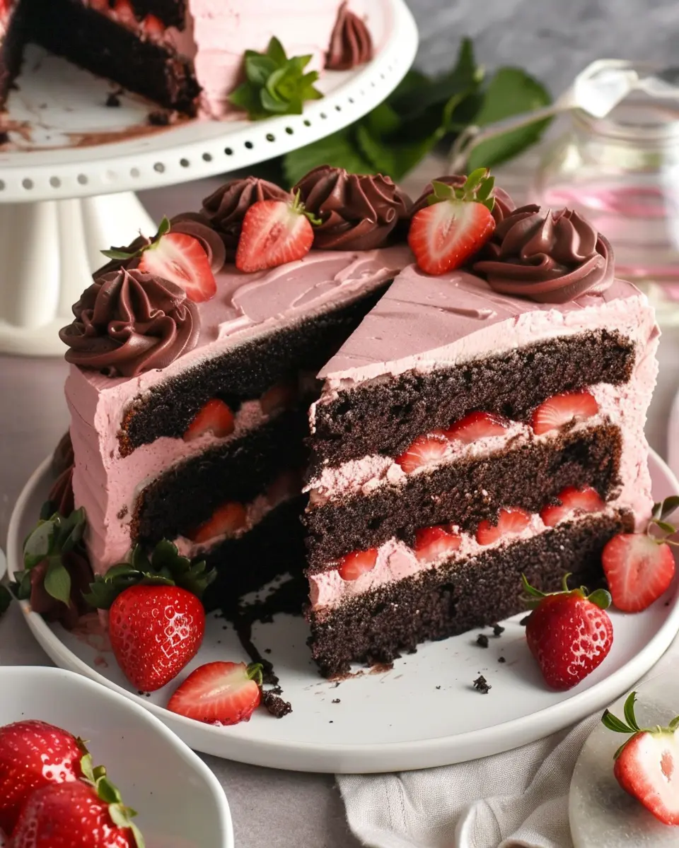 Presentation can elevate your strawberry chocolate cake from delightful to extraordinary. Try layering slices on a chic serving platter, scattered with whole strawberries and mint leaves for a pop of color. You could also use a cake stand to create height, adding to the visual appeal. For an artistic touch, dust the top with powdered sugar or cocoa powder, or even create a glossy ganache finish. And don’t forget, a few edible flowers can add that extra wow factor to your dessert!