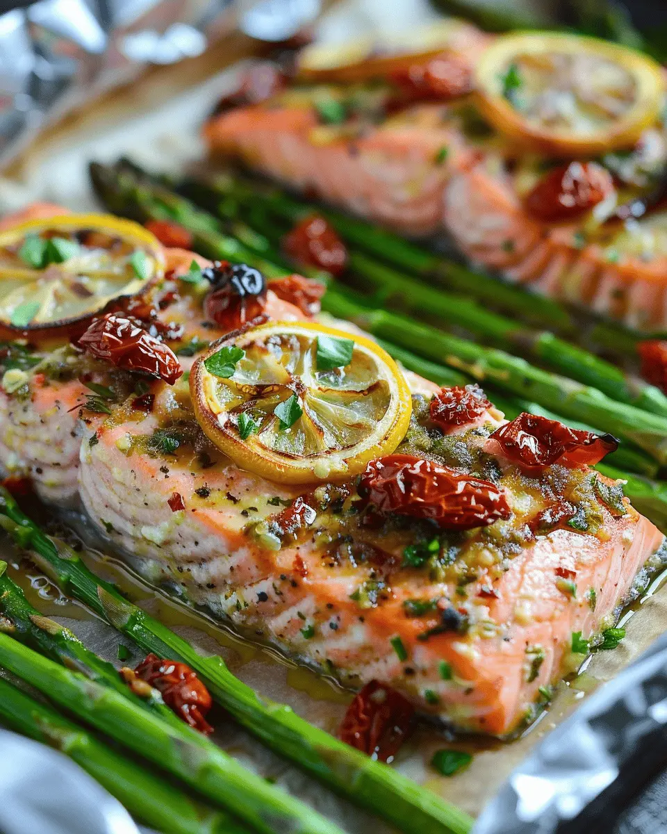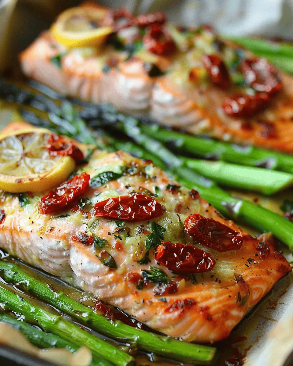 Delight in the vibrant flavors of sun-dried tomatoes paired with lemony baked salmon and fresh asparagus.