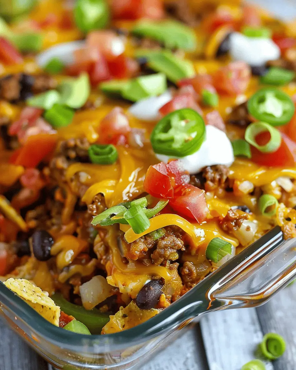 Now comes the fun part: assembly! Preheat your oven to 350°F (175°C). Spread a layer of the beef mixture across the bottom of your casserole dish, then sprinkle a generous layer of the crushed tortilla chips—a crunchy base gives this dish that signature walking taco flair! Follow it up with a layer of cheese; for an extra cheesy delight, don’t hold back! Repeat the layers—beef mixture, chips, and cheese—until you run out of ingredients, topping with cheese at the very end. This layering technique ensures every bite is packed with flavor and texture.